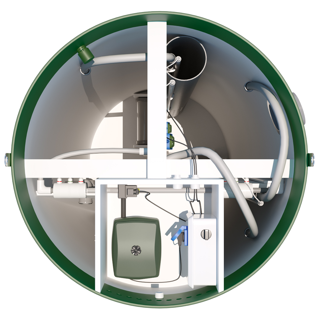 Распределительно-регулировочный узел размещён на внешней стороне стенки камеры с компрессорами. Из него идут воздуховоды к каждому потребителю станции автономной канализации.